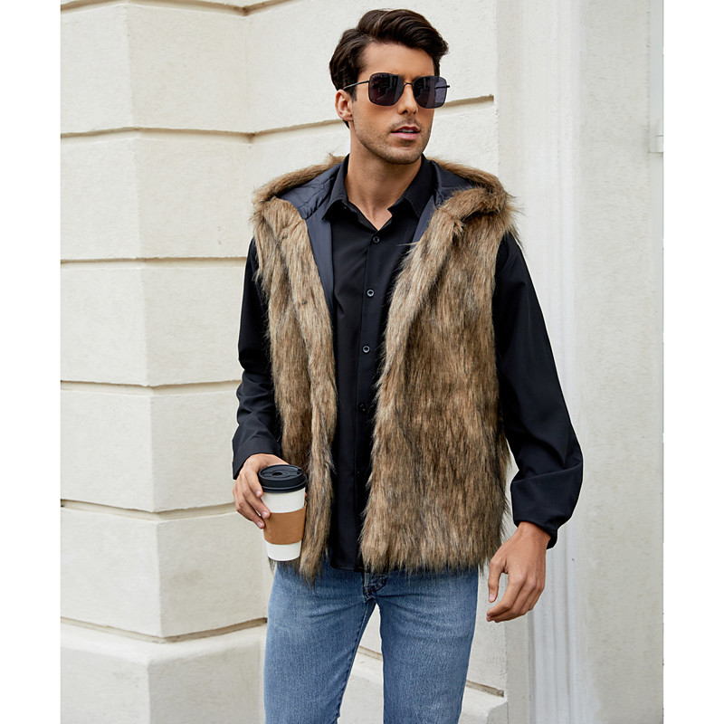 Men's Fleece Vest Hoodie Vest Faux Fur Vacation Casual Daily Wear Going out Fashion Basic Fall Spring Fall Hooded Acrylic Faux Fur Comfortable Plain Zipper V Neck Regular Fit Black White Brown