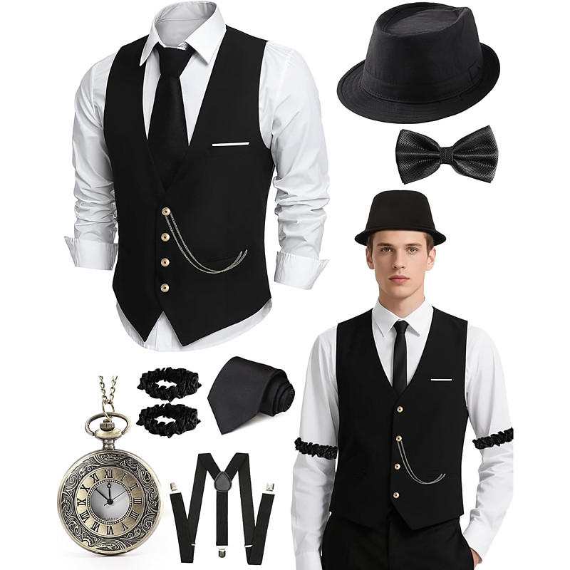 Set Retro Vintage Roaring 20s 1920s Outfits Vest Waistcoat The Great Gatsby Gentleman Fashion Fancy Dress Men's Christmas Halloween Carnival Prom Bachelorette Party Festival Adults' Cravat Vest More