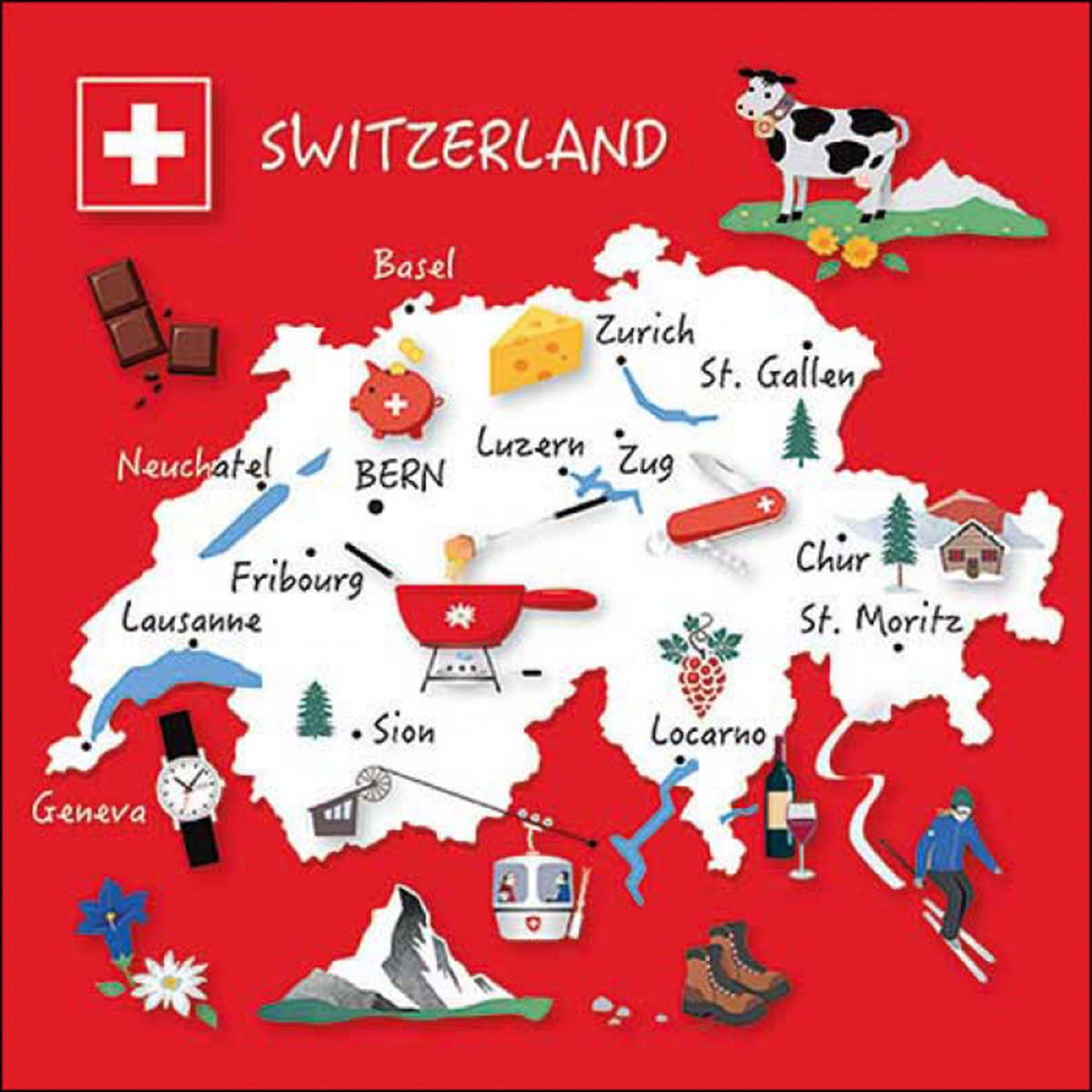 Ambiente 20 Servietten Papier 33x33cm 3-lagig - hochwertige Einweg Papierservietten Schweiz Karte Reise Souvenir Alpen Skifahren Fondue Uhren Zürich Party Deko