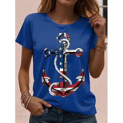 Damen T Shirt Grafik Anker Vintage Stilvoll Klassisch Kurzarm Rundhalsausschnitt Normale Oberteile Täglich Wochenende Druck Blau Schwarz Weiß Sommer Frühling
