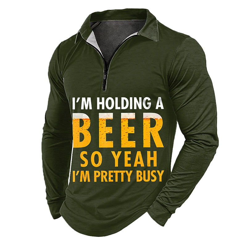 Mens Long Sleeve Graphic Polo Shirt: I'm Holding a Beer So Yeah I'm Pretty Busy Hobbies Lifestyle Humor