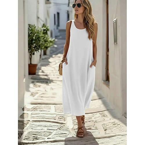 Per donna Abito Midi Finto cotone e lino Vestito Canotta Moderno All'aperto Vacanza Ferie Vestibilità comoda Semplice Senza Maniche Collo a U Bianco Rosa Arancione Estate Primavera