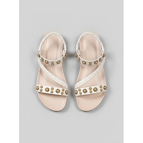 sandali bianchi intrecciati da donna con accenti di borchie di perle finte e suola comoda: calzature estive alla moda per abbigliamento casual e uscite in spiaggia