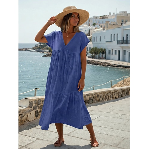 Per donna Abito Midi 100% cotone Abito in cotone e lino Moda Moderno All'aperto Vacanza Ferie Vestibilità comoda Semplice Manica Corta Scollo a V Blu Nero Bianco Verde chiaro Estate Primavera