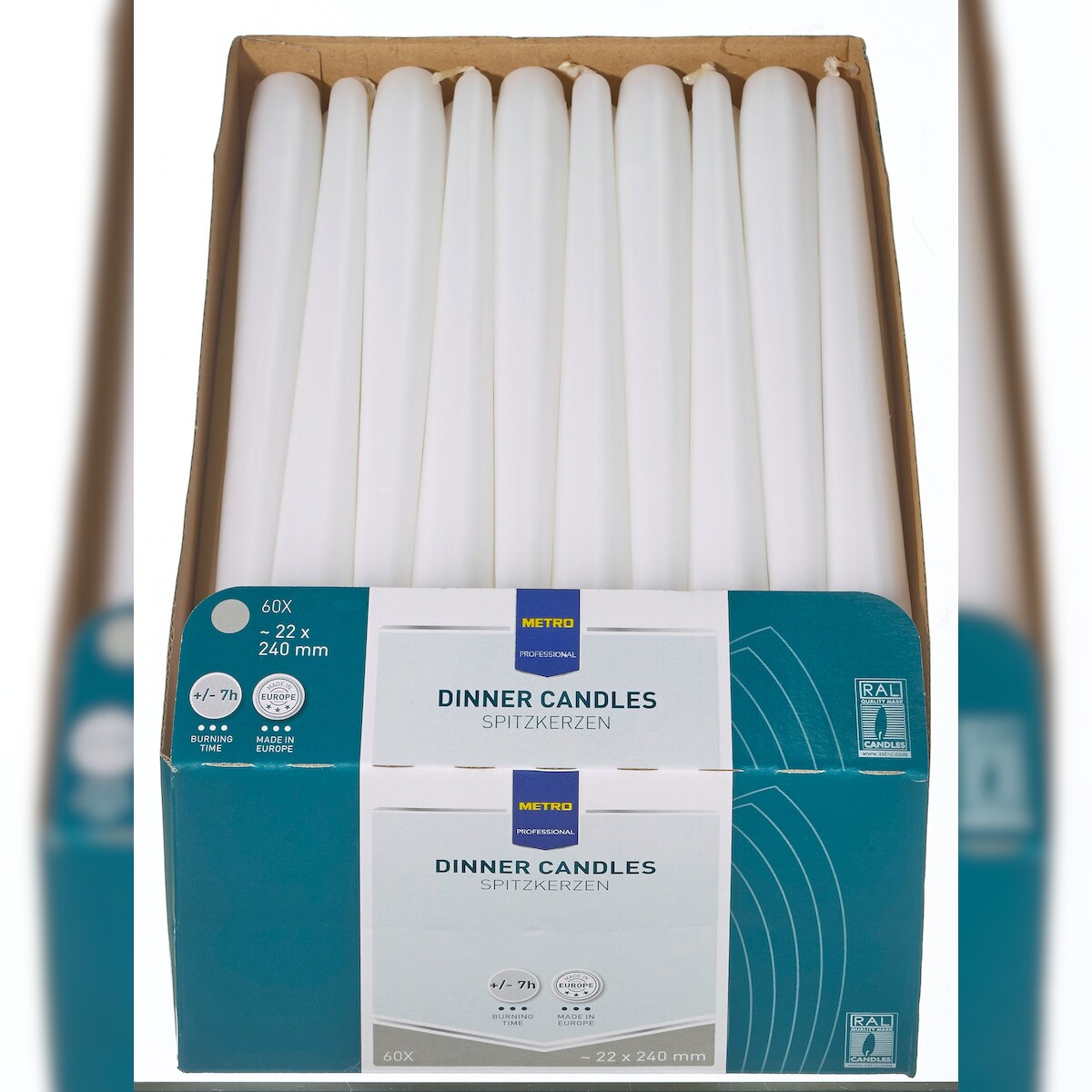METRO Professional Spitzkerzen, Paraffin, 2.2 x 24 cm, ca. 7 Std., weiß, 60 Stück