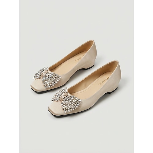 Ballerine da donna color champagne con tacco basso e zeppa nascosta – eleganti décolleté decorate per la madre della sposa, perfette per matrimoni in città. eventi formali