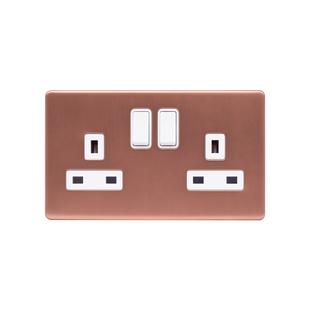 Lieber Brushed Copper 13A 2 Gang Switched Socket - Double Pole - White Insert Screwless - Size: 146mm x 86mm x 2.65 mm