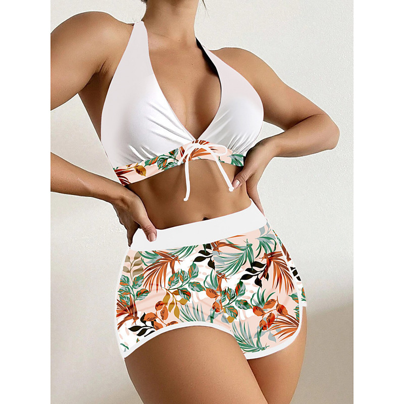Women's Bikini 2 Piece Swimsuit Palm Shorts Backless Slim Vacation Beach Wear Floral Halter Neck Sleeveless Bathing Suits