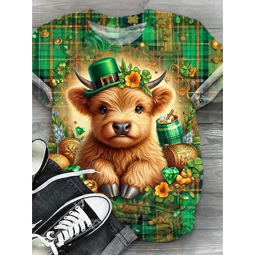 T-shirt da donna per il Giorno di San Patrizio floreale mucca stilosa classica casual maniche corte collo a giro top regolari stampa quotidiana bianco estate primavera