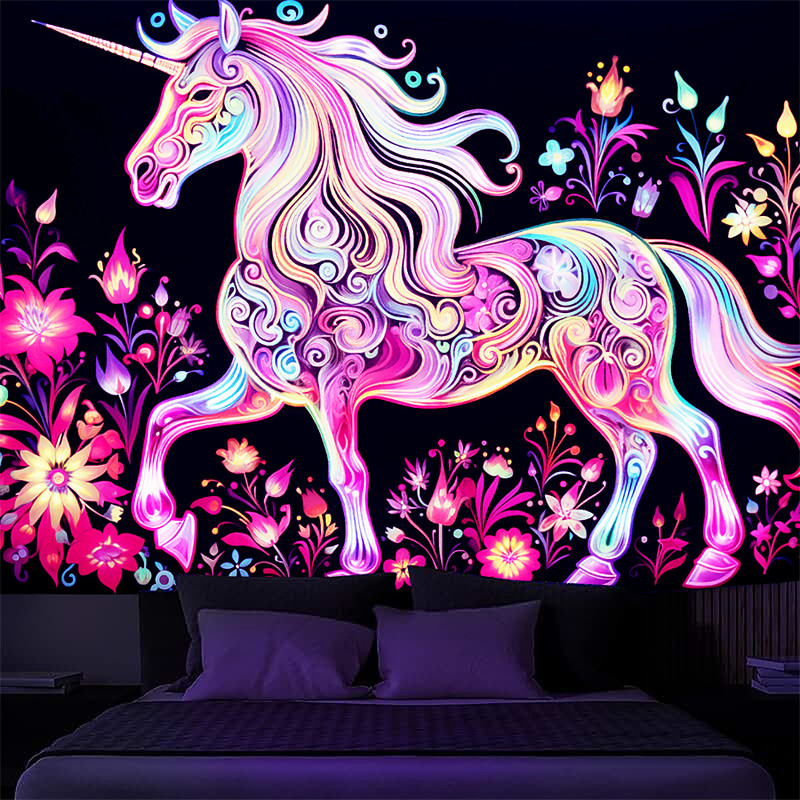 Blacklight Tapestry UV Reactive Glow in the Dark Glow Party Neon Unicorn Animal Psychedelic Trippy Misty Hanging Tapestry Wall Art Mural for Living Room Bedroom