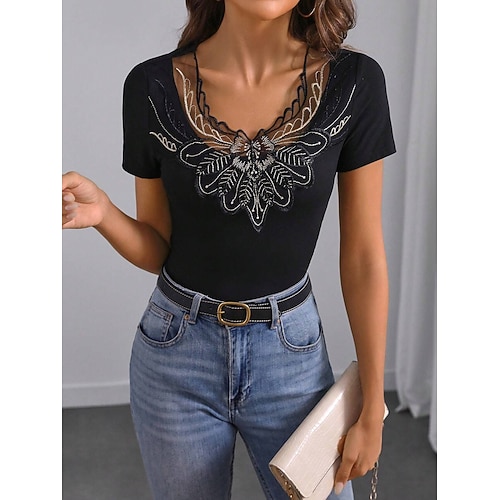 Per donna T-shirt ricamata Grafico Elegante Moda Casual Manica Corta Scollo a V Top Regolari Quotidiano Uscire Weekend Patchwork Ricamato Nero Estate Primavera