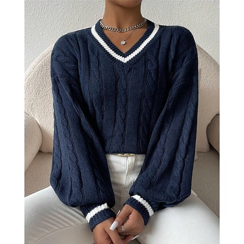 Per donna Felpa Maglione Moda Casual Blocco di colori A Coste Scollo a V Lavorato a maglia Manica Lunga Top Regolari Maglia All'aperto Quotidiano Weekend Nero Blu marino Autunno Inverno