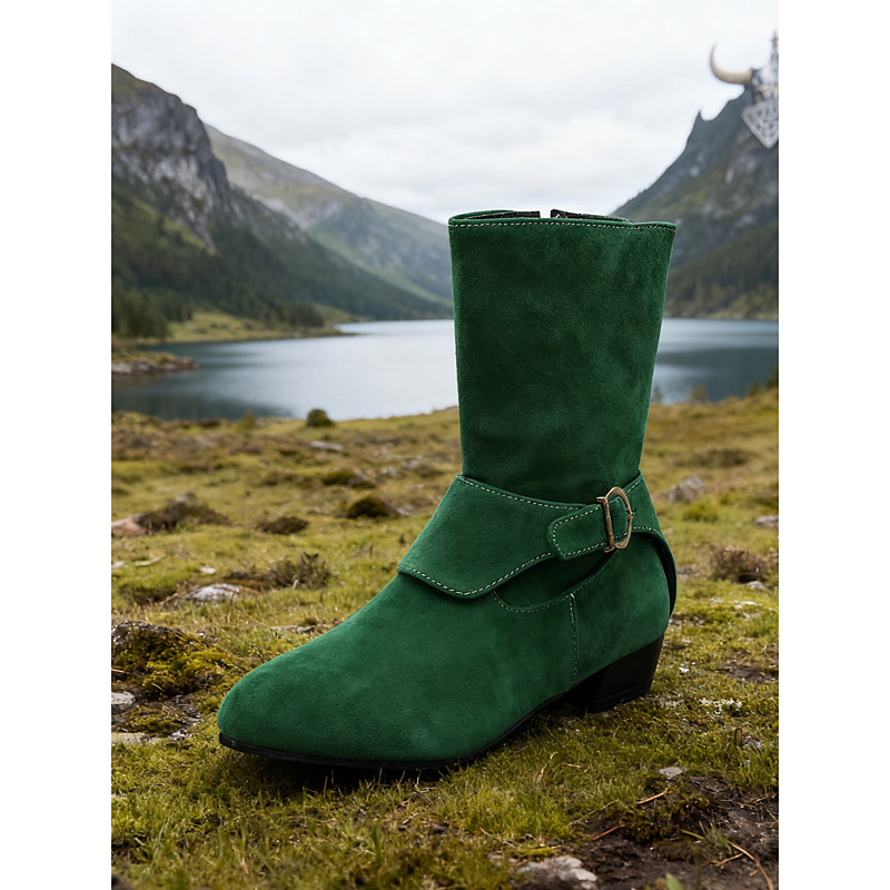Women's Green Suede Heeled Boots with Faux Fur Cuff, Trendy Chunky Heel, Perfect for Winter Holidays, Christmas Parties and Festive Occasions