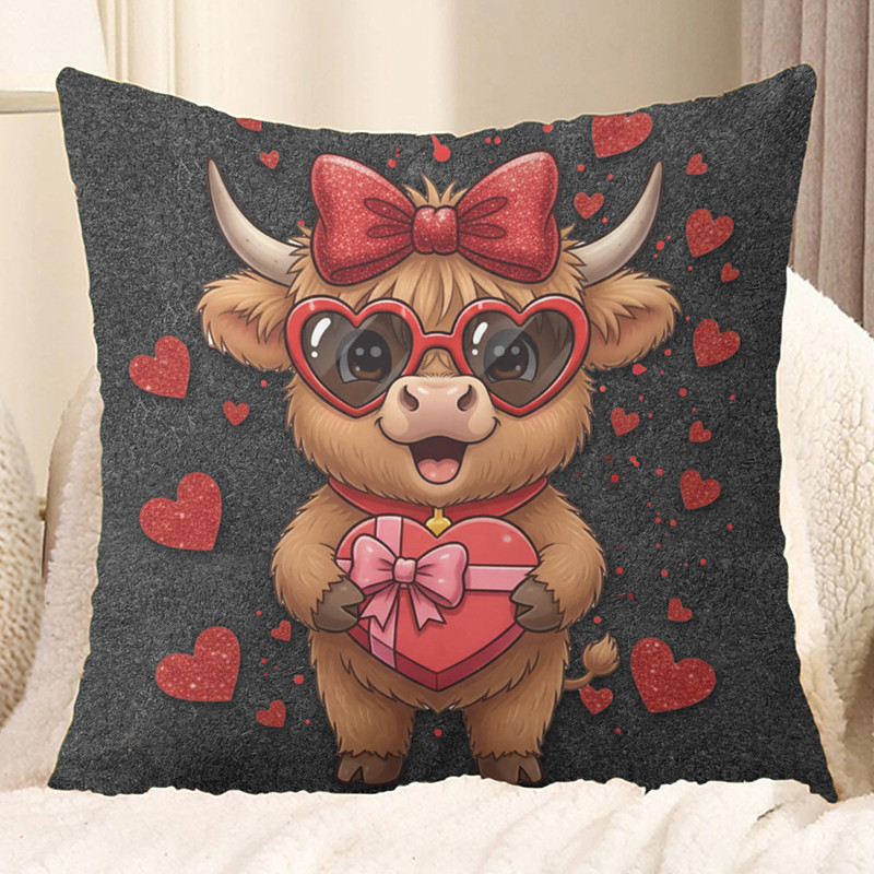 Valentine's Day 2D Flat Print Dark Pillow Cover, Cow with Pink Heart Glasses, Holding Roses Hearts, Waving Design, Cute Valentine's Day Decorative Cushion Case