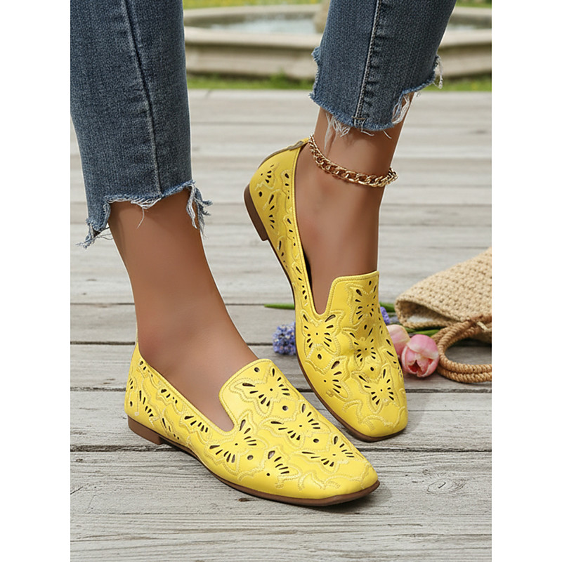 Women's Yellow Cutout Flat Shoes – Breathable Perforated Design, Vintage-Inspired Slip-On Loafers for Spring Summer, Walking, Travel, Leisure and Everyday Outfits