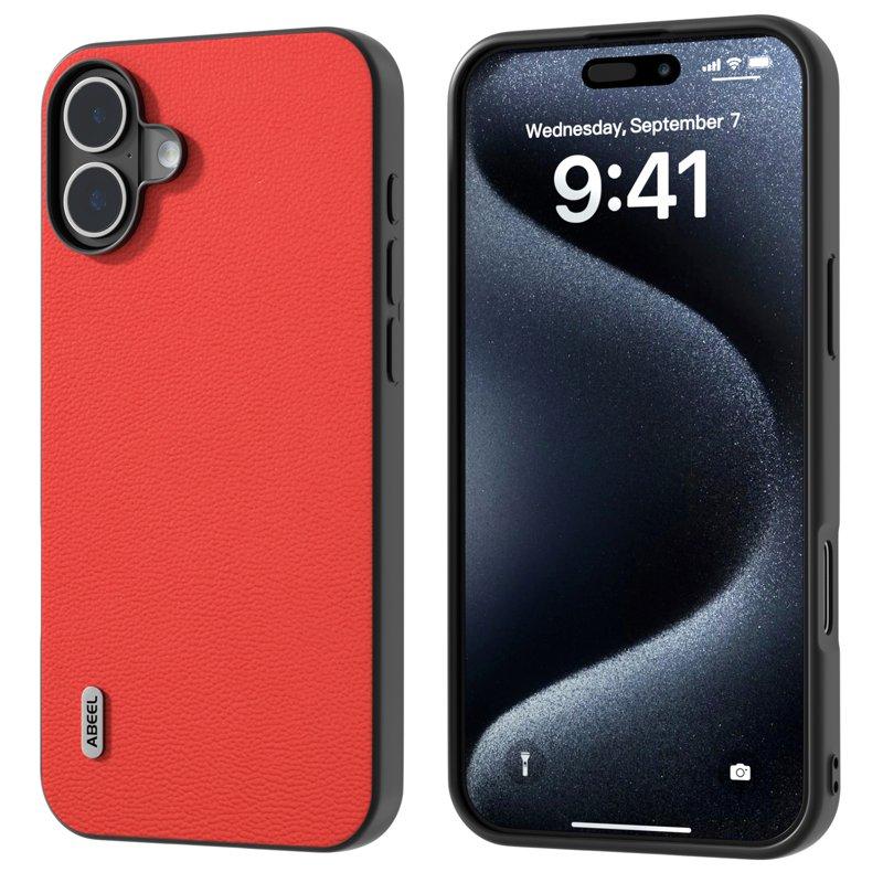 ABEEL Mobilskal till iPhone 16 Plus Äkta Läder Coated PC+TPU Röd