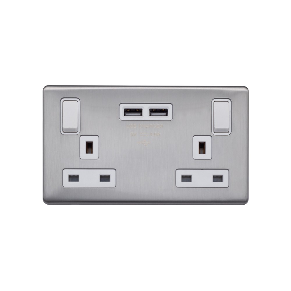 Lieber Brushed Chrome 2 Gang 13A DP Socket with 2 x USB-A 4.8A - Size: 146mm x 86mm x 2.75 mm