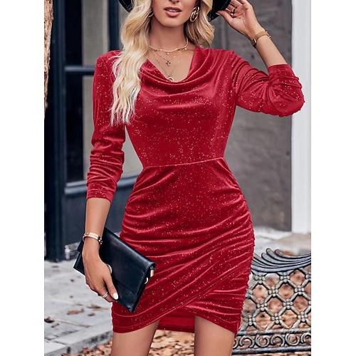 Abito Mini in Velluto per Donna Abito A Fascia Elegante Festa Cocktail Festa Matrimonio Ospite di Matrimonio Vestibilità Regolare Colore Unito Maniche Lunghe Collo a Cowl Nera Vino Rossa Verde