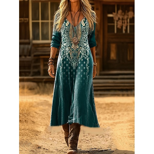 Abito Midi da Donna V Collo Maniche Lunghe Kaftan Leggero Comodo A Line Abito Casual Quotidiano Comodo Fit Grafica Geometrica Maniche Lunghe V Collo Blu Viola Marrone Verde Autunno