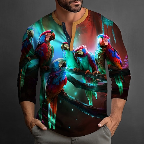 Herren Grafik Papagei Henley Hemd Langarm 3D-Druck Mode Täglich Lässig Lässig Ferien Ausgehen Frühling Herbst Blau Rote Dunkelgrün Grün Dunkelblau Henley Henley T-Shirt