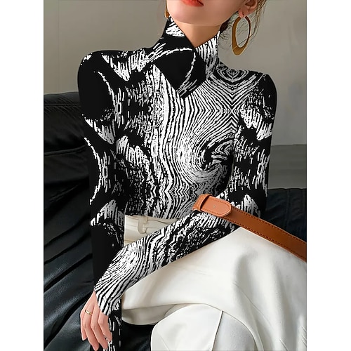 Per donna Maglietta Grafico Trama Elegante Vintage Classico Manica Lunga Dolcevita Collo Alto Collo asimmetrico Top Regolari Quotidiano Stampato A Strati Blu Nero Primavera Autunno Inverno