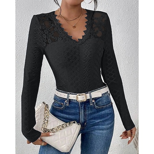 Per donna Top con cuciture in pizzo Tinta unica Elegante Moda Sexy Manica Lunga Scollo a V Top Regolari Quotidiano Uscire Weekend Pizzo Traforato Blu Nero Bianco Autunno Inverno