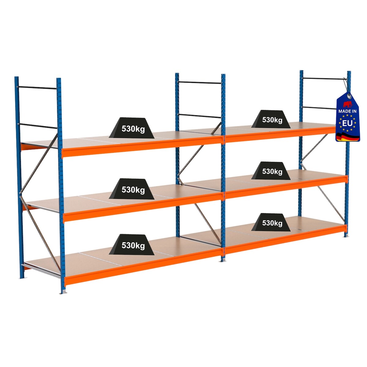 PROREGAL Industrie Schwerlastregal MAXIMUS PRO, Komplettregal, HxBxT 250x500x100cm, 3 Ebenen, Spanplatten-Fachboden, Fachlast 530 kg, Blau/Orange