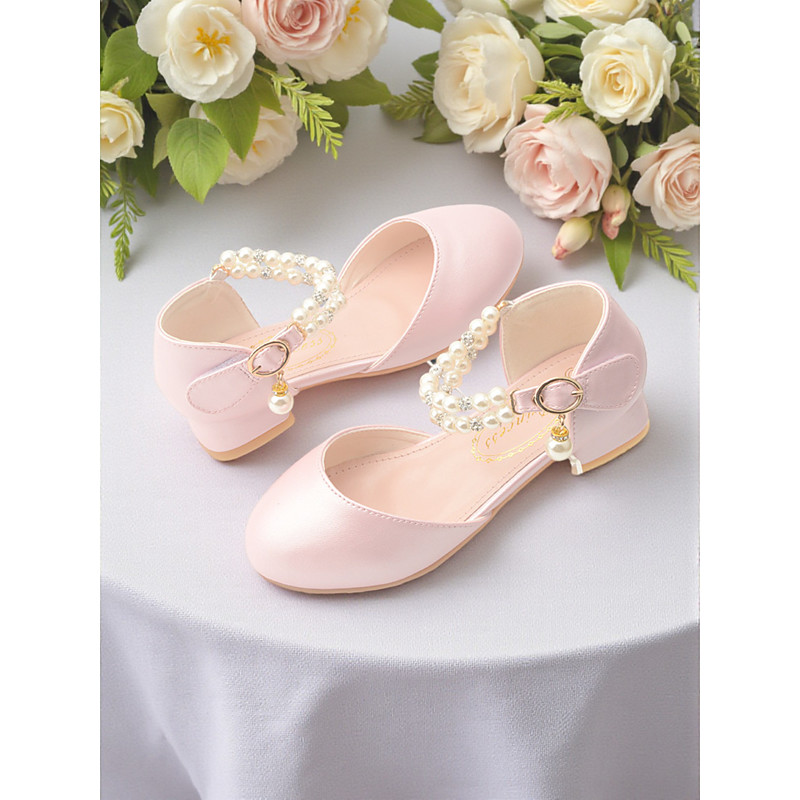 Kid's Ivory Pearl Ankle Strap Flower Girl Shoes with Rhinestone Beaded Detail, Soft Cushioned Low Heel, Elegant Princess Style for Girls, Perfect Wedding Flower Girl Shoes for Ceremonies and Formal Oc