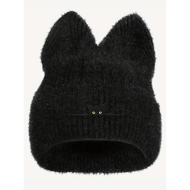 Women's Fuzzy Knit Cat Ear Beanie Hat, Cute Winter Warm Cap with Black Cat Embroidery, Stylish Christmas Gift for Girls Women