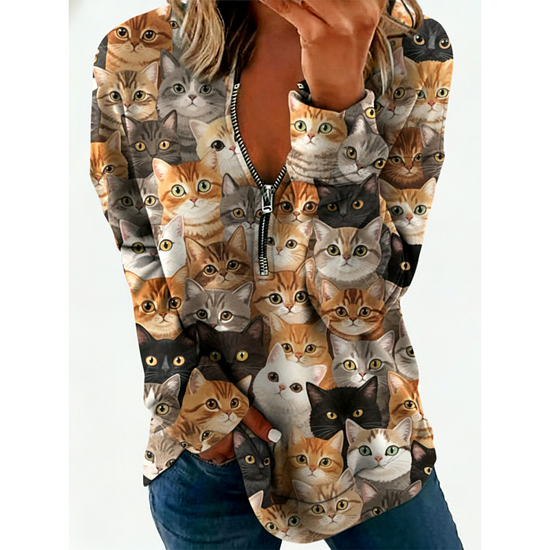 Women's Pullover Zip Up Sweatshirts Graphic Cat Fashion Casual Long Sleeve Half Zip Regular Tops Casual Dailywear Drawstring Print Black Spring Fall