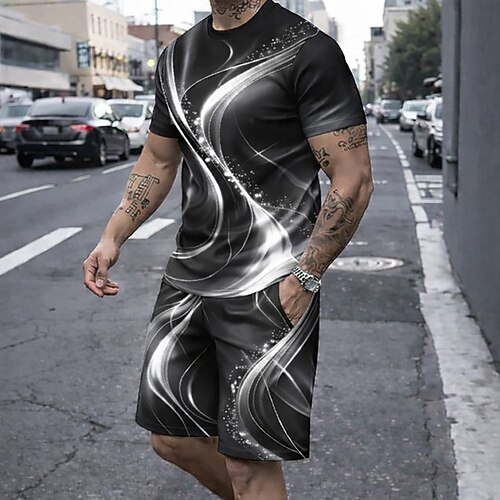 Herren Geometrisch Linie 2St T-Shirts-Sets Sommeroberteile Kurzarm Kurze Hosen Rundhalsausschnitt Lässig Täglich Outdoor Ausgehen 3D-Druck Sommer Blau Rote Purpur