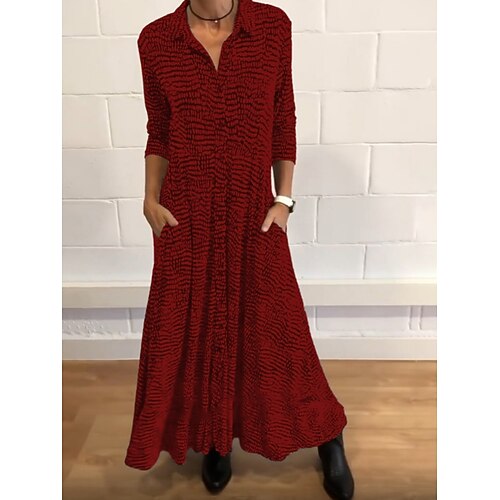 Damen Maxikleid A Linie Kleid Lässig Täglich Lässiger Schnitt Gestreift Langarm Revers Blau Schwarz Rote Frühling Herbst