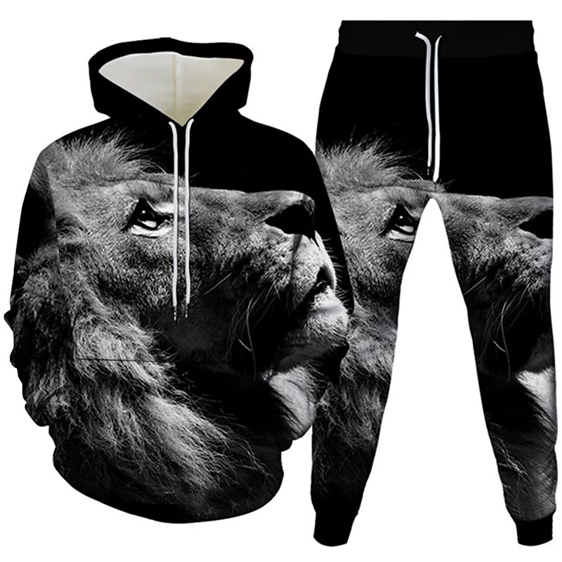 Men's Graphic Lion 2pcs 3D Sweatshirt Sets Hoodie Tracksuit Long Sleeve Long pants Hooded Streetwear Basic Casual Sports Outdoor Casual Sports Zipper Print Spring Fall Wine Red Black Yellow