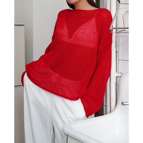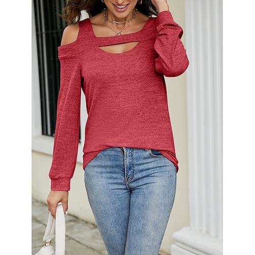 Per donna Blusa Tinta unica Elegante Casual Manica Lunga Collo a U Top Regolari Quotidiano Traforato Blu Nero Rosso Verde Grigio Primavera Autunno Inverno