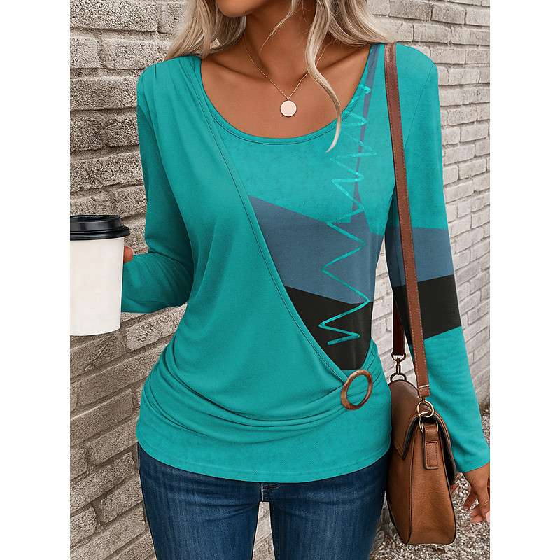 Women's T Shirt Graphic Geometric Vintage Stylish Casual Long Sleeve Crew Neck Regular Tops Daily Patchwork Print Blue Yellow Red Dusty Blue Purple Fall Winter