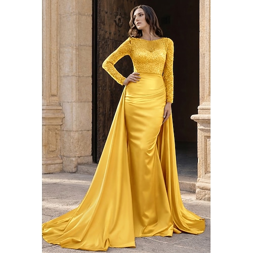 Sirena Tromba Lunghezza al pavimento Abito da Sera Elegante Brillare Splendere Manica Lunga Scollo Illusione Carnevale Mascherata Abito Champagne per la Madre della Sposa Raso Con Paillettes con