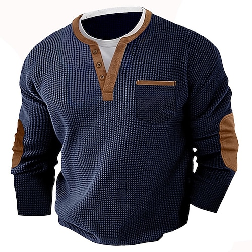 Herren Waffel T-Shirt T Shirt Waffel-Henley-Hemd Langarm Rundhalsausschnitt V Ausschnitt Ganzjahres Einfarbig Traditionell / Vintage Lässig Falscher Zweiteiler Outdoor Heim Sport Outdoor Marineblau
