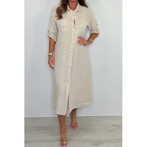 Per donna Abito Midi Abito Camicia Abito in cotone e lino Classico All'aperto Quotidiano Ferie Vestibilità regolare Semplice Manica Lunga Colletto a Camicia Bianco Verde militare Blu Albicocca Estate