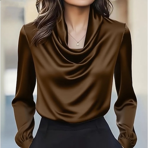 camicetta da donna in raso elegante top regalo di Natale semplice elegante quotidiano alla moda manica lunga collo a cappuccio top normali quotidiano drappeggiato nero bianco vino marrone autunno