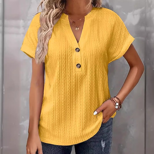 Per donna Blusa Tinta unica Elegante Classico Casual Manica Corta Scollo a V Top Regolari Quotidiano Bottoni Bianco Giallo Vino Marrone Verde Primavera