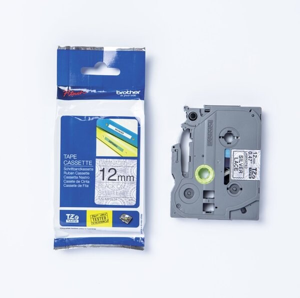 Brother Schriftbandkassette TZE-MPSL31, laminiert, 12 mm x 4 m, schwarz auf silbernen Spitzen.