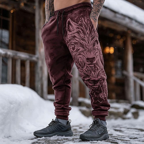 Herren Tiermotiv Wolf Wikinger Jogginghose Hose Mittlere Taille Kordelzug Elastischer Bund Vintage-Retro Outdoor Campen und Wandern Jagd Sportliche Jogginghose mit Taschen Herbst Winter 3D-Druck Blau