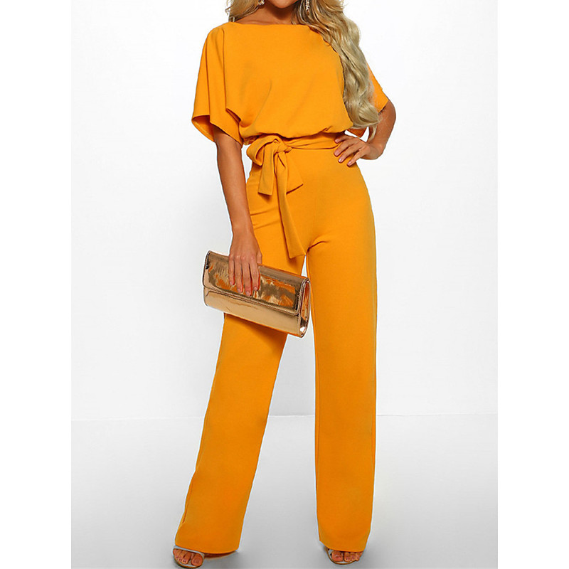 Women's Jumpsuit Elegant Belted Waist Red Wide-Leg Round Neck Short Sleeve Solid Color Party Work Casual Spring Summer Clothing Apparel