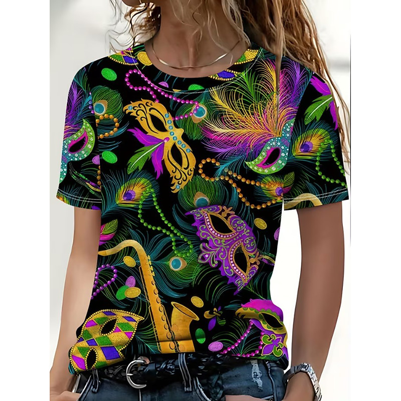 Carnival Mardi Gras Women's T Shirt Graphic Vintage Fashion Stylish Short Sleeve Crew Neck Regular Tops Daily Print Black Summer Spring