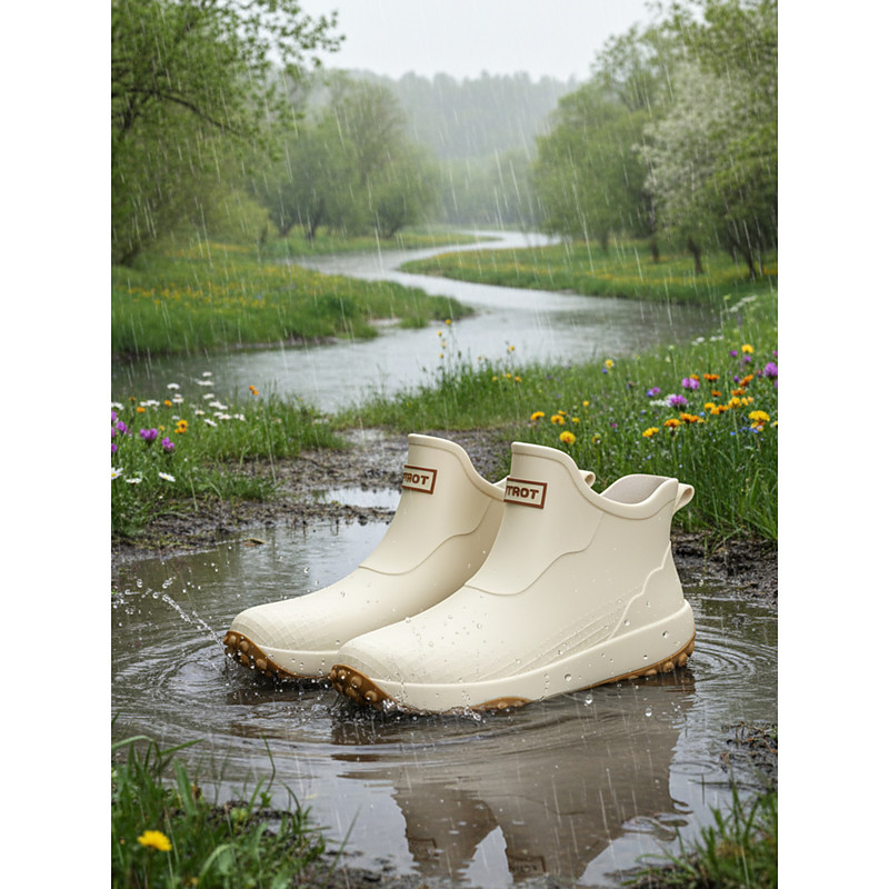 Women's Beige Short Rain Boots - Waterproof Ankle Boots with Non-Slip Traction Sole Minimalist Stylish Design for Rainy-Day Walks, Outdoor Errands, Park Visits Casual Daily Wear