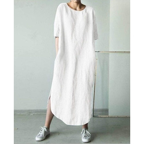 abito midi in cotone e lino da donna, abito tubino, abito a trapezio, abito estivo con volant, vacanza, casual, quotidiano, vestibilità ampia, tinta unita, manica corta, girocollo, giallo