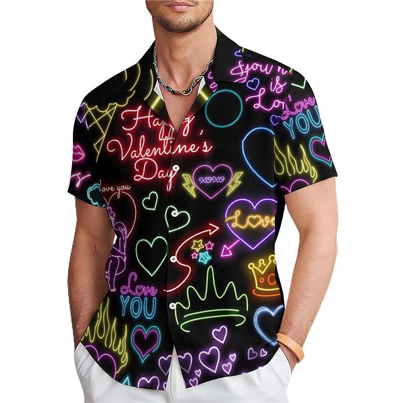 Valentine's Day Heart Graffiti Casual Men's Shirt Daily Wear Going out Weekend Summer Turndown Short Sleeves Black, Red, Purple S, M, L 4-Way Stretch Fabric Shirt