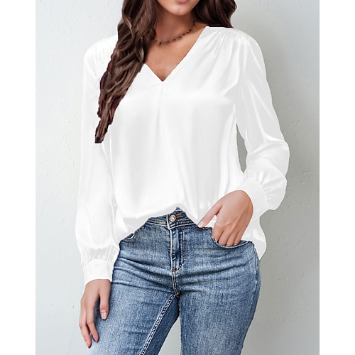 Per donna Camicia Elegant Elegante Raso/Satin Semplice Moderno Casual Manica Lunga Scollo a V Top Regolari Quotidiano Ferie Uscire Arricciato Nero Bianco Giallo Rosa Vino Autunno