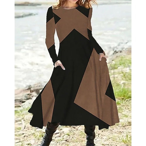Per donna Abito Midi Abito Stampato Vintage Moda Moderno Quotidiano Ferie Uscire Vestibilità regolare Geometrico Manica Lunga Girocollo Vino Marrone Grigio scuro Grigio Primavera Autunno Inverno