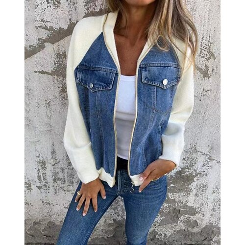 Per donna Giacca Casual Giacca di Jeans Caldo Confortevole Cerniera Tasca Retrò Casual Blocco di colori Vacanza Casa Abbigliamento quotidiano Uscire Regolare Collo alla coreana Vestibilità regolare